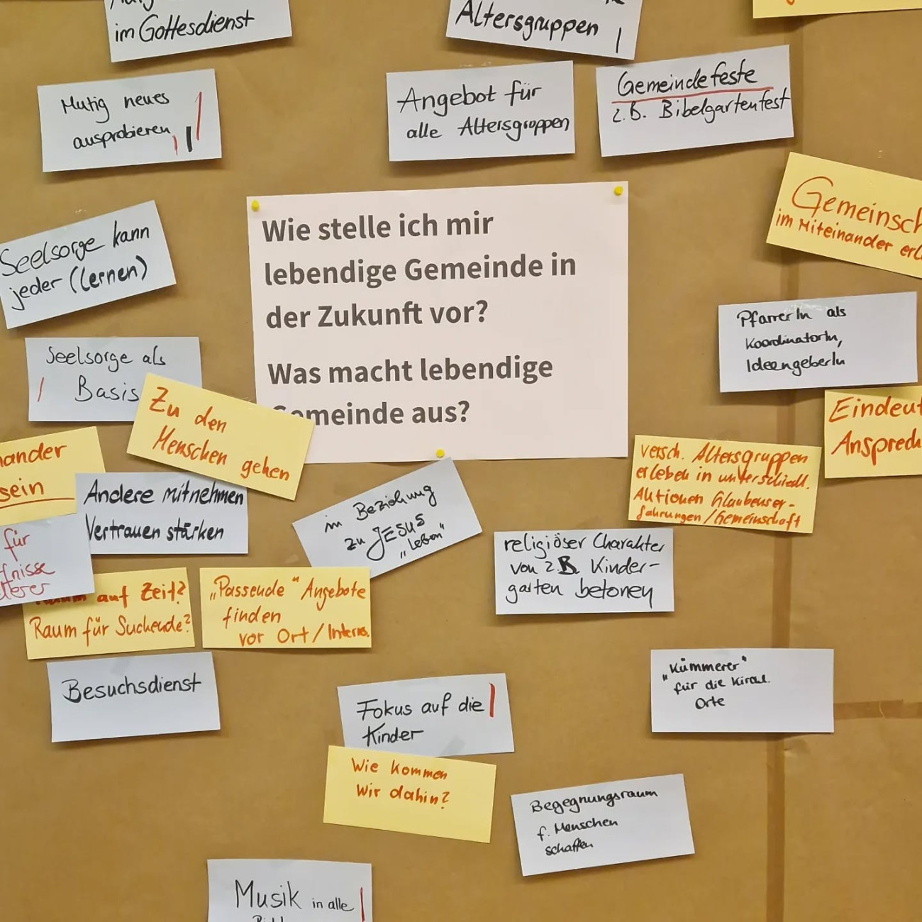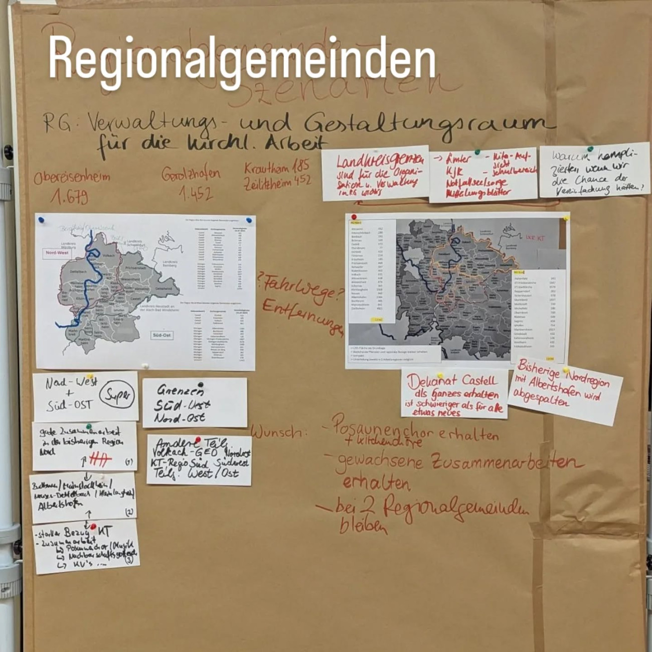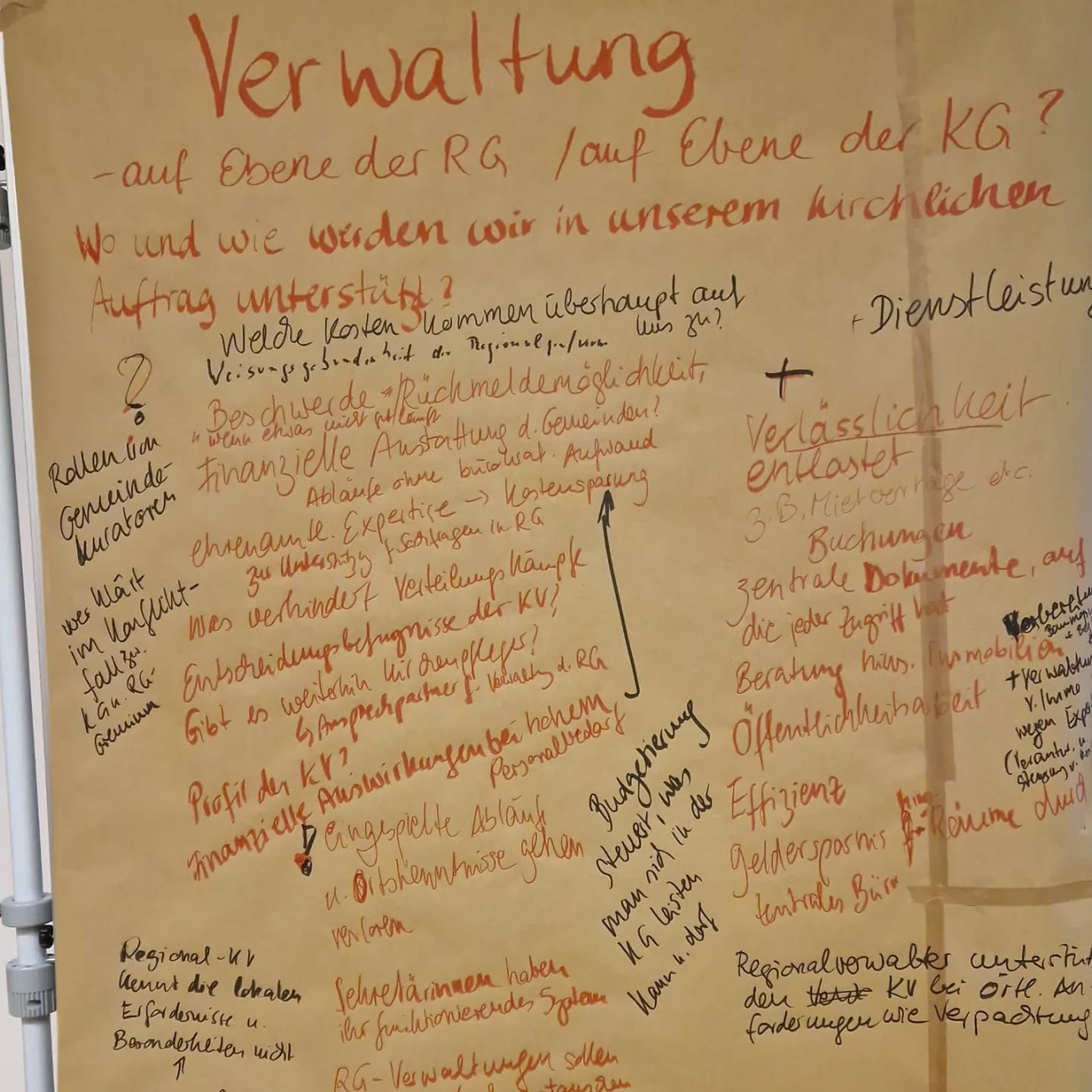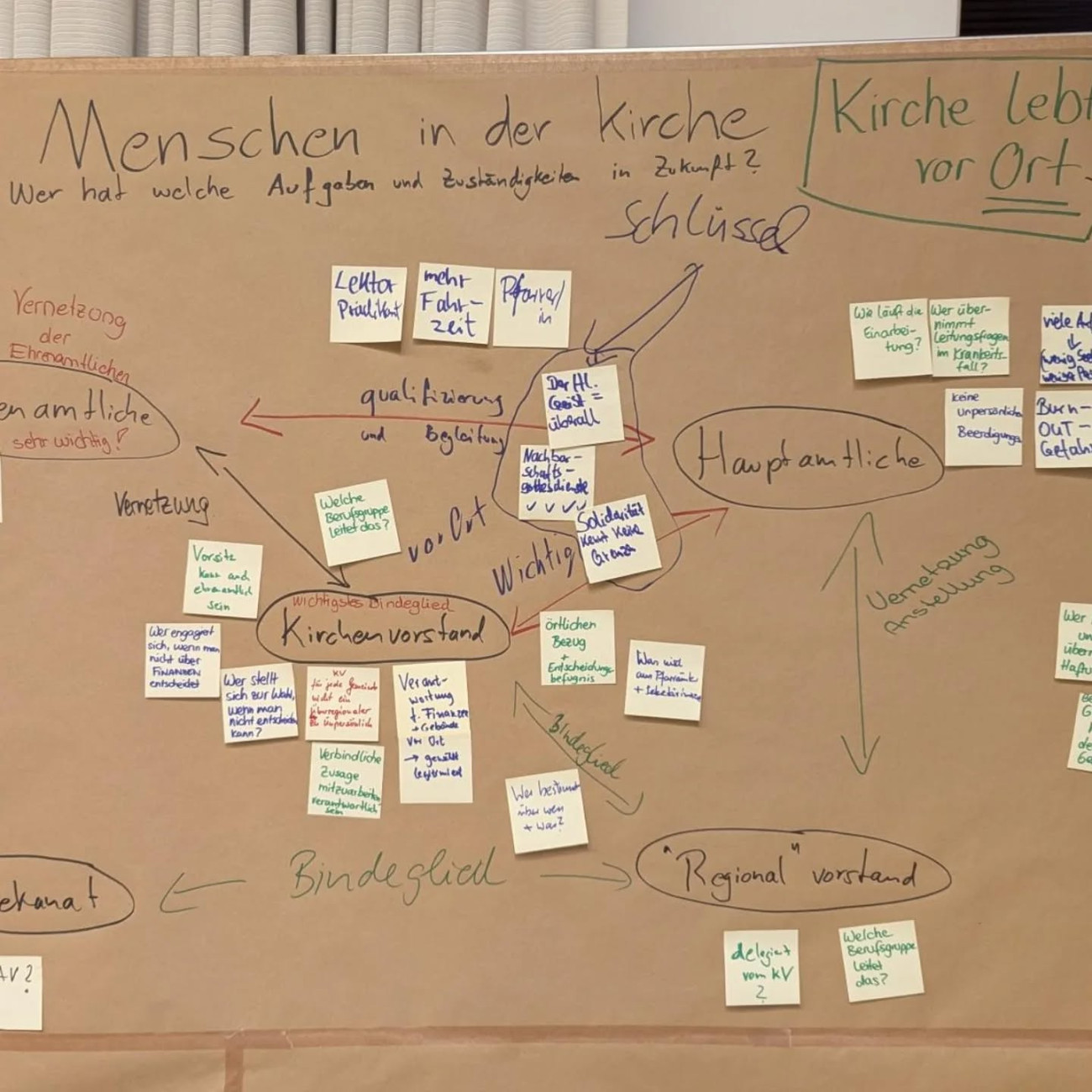 Anhand der Methode "world cafe" kamen sie in kleinen Gruppen in Austausch über die Regionalgemeindestruktur, die anstehenden Immobilienentscheidungen, die Frage der erforderlichen Verwaltungsdienstleistung, über die Zusammenarbeit von Haupt- und Ehrenamtlichen und über lebendige Gemeinde der Zukunft.